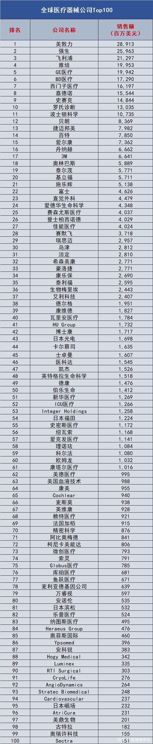國外權(quán)威第三方網(wǎng)站QMED發(fā)布了《醫(yī)療器械企業(yè)百強榜單》,根據(jù)2020年銷售狀況對全球醫(yī)療器械公司進(jìn)行了排名。