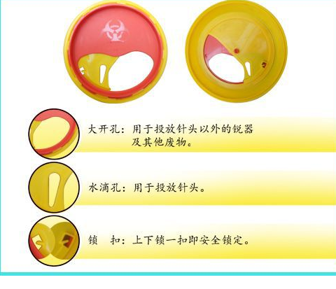 特征:圓形利器盒采用不含PVC的硬質塑料制造,具備耐穿刺,不滲漏,不易破裂、易于焚燒,封閉后完全不能正常打開的基本性能;利器盒整體呈黃色,盒體側面注明“損傷性廢物”,并印有“醫療廢物警示標識”