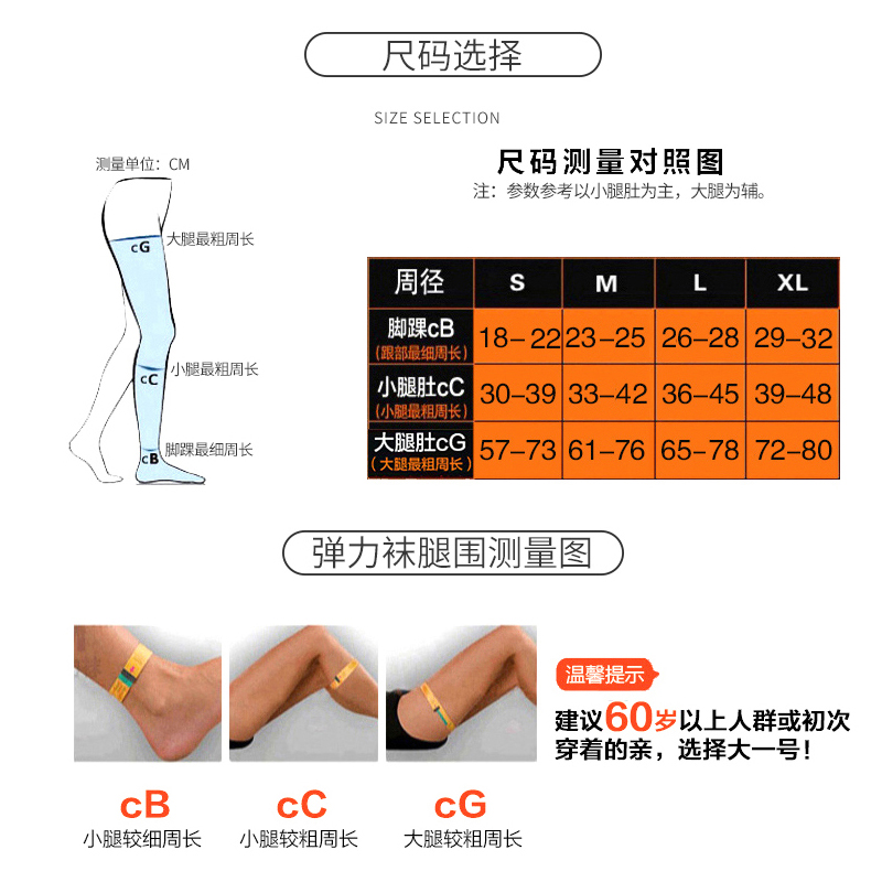 為患者正確量取尺寸,測(cè)量襪子最好在清晨,下肢水腫最輕的時(shí)候進(jìn)行。根據(jù)退的粗細(xì)選擇合適的尺寸的彈力襪。