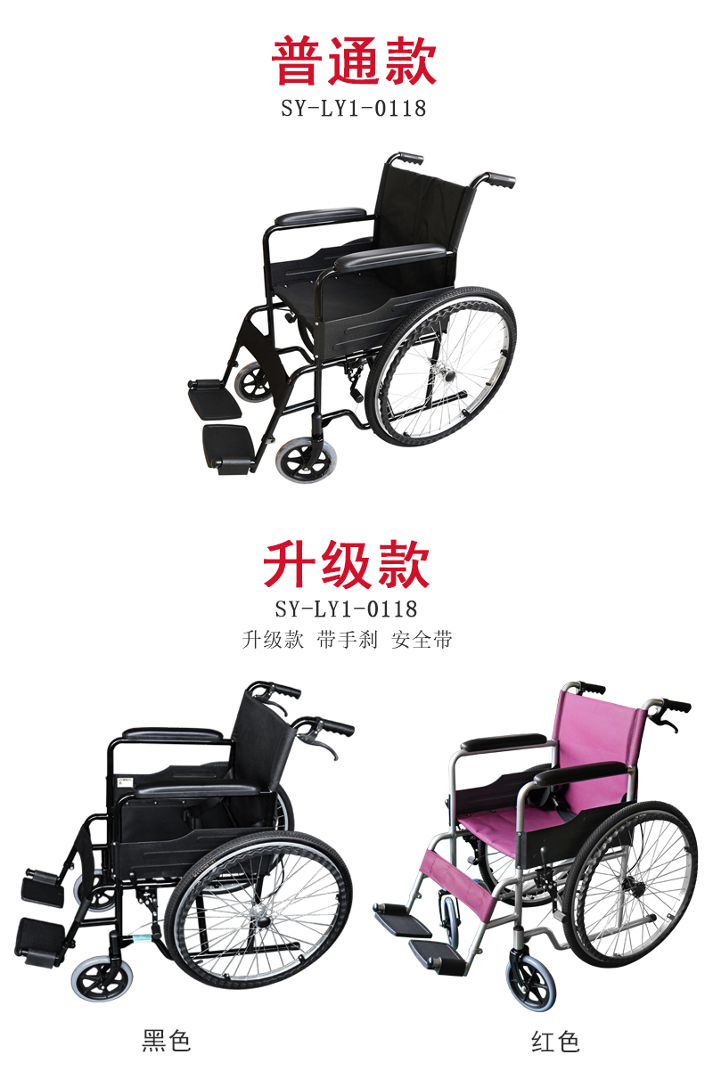 市場上銷售的手動四輪輪椅車品種繁多,按檔次分有高檔和中低檔,按功能分有普通型和特殊型。普通型具有能乘坐、自助代步、折疊等功能,特殊型輪椅則是按使用者的需求設計,目前市場常見的特殊型輪椅又可分為坐便器輪椅、高靠背輪椅、可躺式輪椅、單手驅動輪椅等。