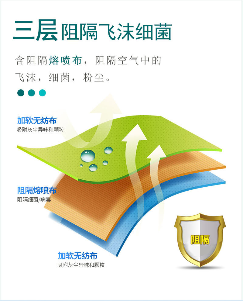 2、醫用口罩除了阻隔細菌、病毒外。最主要的功能在于阻隔液體噴濺。這點是區分于其他口罩的關鍵點。如血液等具有傳染性的液體噴濺是具備一定壓力的,也有一定粘稠度。要使得液體不浸潤于口罩。因而有阻隔有壓液體之類需求的,選用醫用口罩是再好不過的選擇。